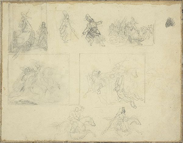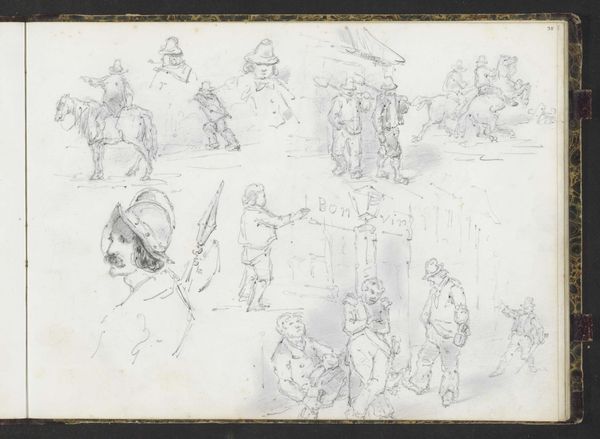 Curator: Today, we're observing a page extracted from a sketchbook belonging to Lambertus Lingeman, titled "Studieblad met ruitergevechten, vissers, koppen en honden," dating approximately from 1839 to 1894. Editor: It has the immediacy of raw thought; it feels both urgent and fleeting, filled with potential. There is an intense focus on men fighting on horses juxtaposed with intimate character sketches on the same surface, which lends itself to further interrogation of its function. Curator: Precisely, the layering offers us different scales and densities of linework that are fascinating. The way he uses quick, short strokes for the figures engaged in battle, versus longer, more deliberate lines for the portraits... Editor: It makes me question: is this simply a collection of sketches or a comment on different types of human subjects? Are we meant to juxtapose the anonymous bodies in war against intimate, named portraits? The placement, the intentional ordering…it all speaks to larger socio-political relations and their representations. Curator: Perhaps the relationships you are suggesting emerge precisely through Lingeman's manipulation of form and the tonal variation he gets by using what appears to be primarily pencil and possibly touches of watercolor on toned paper. The repetition of shapes generates a very lively page. Editor: I agree, but for me, those shapes are imbued with cultural baggage. Who gets remembered? Who becomes cannon fodder? Lingeman leaves so many threads for us to explore. I even spot dog figures interspersed as a domesticated creature watching the humans at war... Curator: Fascinating perspective, your reading definitely emphasizes the interplay of individual and collective experience as an exercise of power and artistic memory, something I had missed at first sight, too focused, perhaps, on its graphic qualities. Editor: And your point about the technical elements, the rapid strokes and deliberate portraits is incredibly valuable for unpacking all the latent cultural narratives embedded here.