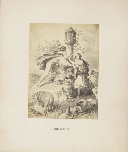 Editor: This is "Heidenröslein achterna gezeten door een herdersjongen" by Heinrich Sachs, likely made between 1841 and 1901, and it's an engraving. There's a definite romantic quality, with a shepherd boy seemingly chasing after a girl, and some sheep, all under what looks like a shrine or monument. What are your thoughts when you look at this piece? Curator: As a materialist, I’m drawn to the engraving process itself. Consider the labor involved: the artist meticulously carving lines into a metal plate, the precise control required to render such detail, the physical exertion. What does this laborious production tell us about the value placed on this image and its dissemination? Editor: I hadn’t really considered the physicality of the process. Is the act of creating the print important to its interpretation, even if that labor isn't immediately apparent to the viewer? Curator: Absolutely! The print wasn't a unique artwork accessible to an elite, but instead became reproducible. We need to consider its social circulation, it would be relatively inexpensive and available to a growing middle class keen on acquiring art. What kind of aspirations or beliefs might an image like this reinforce or challenge within that audience? Editor: It's interesting to think about how the Romantic style, with its focus on emotion and nature, might have been made more accessible through this type of printmaking. It’s not just about the idealized scene, but also about who could own it, thanks to the material process. Curator: Exactly! It moves us beyond the sentimental narrative of boy chases girl to thinking about art's role in shaping class identity and social values. What stories did ownership of art give its holder power to convey? Editor: So, understanding the materiality – the 'how' of its creation – helps reveal the 'why' it was made and its societal impact? I'll definitely keep that in mind moving forward.