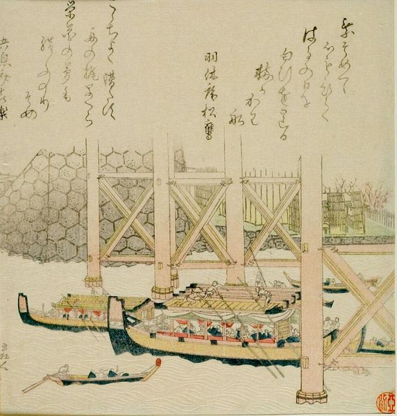 Editor: This woodblock print is by Utagawa Toyohiro, called "Ferry Boat and Nightingale Against the Moon". It feels so serene. What strikes you about its composition? Curator: The arrangement of the image invites immediate analysis. Note the horizontal emphasis achieved through the placement of the boat. The gentle curves mimic the water, suggesting a harmonious visual rhyme. Editor: The color palette is so subtle! Curator: Indeed. The restrained use of color serves to emphasize the linear qualities. Consider the delicate rendering of the waves against the relative solidity of the ferry. How does that contrast influence your reading? Editor: I see it now; the delicate lines create a sense of rhythm and movement. Thanks! Curator: A keen observation. It showcases the artist's masterful control.