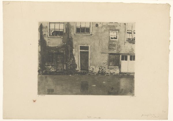 Curator: Here we have Willem Witsen's "Gezicht op de achtergevels van panden aan een gracht in Dordrecht," an etching from around 1898 to 1900. Editor: It's fascinating how Witsen focuses on the back of these buildings, rather than a grand facade. What strikes you about it? Curator: For me, the etching immediately highlights the means of its production. Look closely: the fine lines created through the etching process emphasize the materiality of the copper plate itself and the labour involved in its making. What can that repetitive mark-making tell us? Editor: I guess that repeated labor reminds me of the daily lives lived within those buildings. All those etched lines mimicking the repetition of daily routine. The choice of subject, a mundane view, also hints at the everyday. Curator: Exactly! Witsen isn't trying to create a heroic image. He's documenting the architecture of everyday life, made visible through his chosen materials and processes. Consider too that prints were more widely circulated than paintings. How might this accessibility affect our understanding? Editor: That makes me think about the social context and how this print could reach a wider audience, allowing more people access to art and a glimpse into the lives of others. Maybe it was almost like early photography, providing glimpses into other people’s worlds? Curator: Precisely. And what does that accessibility do to traditional ideas of 'high art' versus 'craft' when this etching is being reproduced and disseminated? It starts to break down those boundaries. Editor: I never considered the art-making process itself in this way before. Now I realize the materials and labor are communicating ideas beyond the surface imagery. Curator: Seeing art this way, as the result of production, labor, and consumption, helps reveal a lot about both the artist's choices, and society in the 19th century. Editor: I will certainly think about that with other art, too. Thank you!