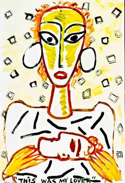 René Marcil created "A Green Cat and his Beautiful Mistress" in 1989 using vivid blocks of colour. The composition, dominated by yellows and reds, creates a striking contrast that draws you in, while the titular cat and mistress present a stark, almost unsettling tableau. The painting plays with formal relationships. The cat's unnatural green is echoed in the background flora, unsettling our expectations of natural colour. This could be seen through a semiotic lens, where colours are not merely representational but carry coded meanings, disrupting conventional notions of beauty and naturalism. Consider the structure: the woman’s elongated face, the stylized cat, and flattened perspective all challenge traditional representational norms. Marcil seems to be asking us to question our assumptions about form and beauty, destabilizing our perception. The bold colours and simplified forms push us towards a new understanding of how art can convey meaning through abstraction and distortion.