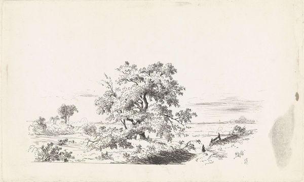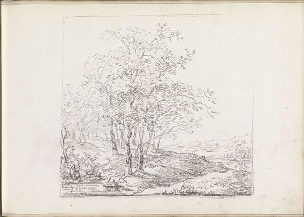 Editor: Andreas Schelfhout's "Bomengroep omheind door een hek," from around 1811, a pencil drawing at the Rijksmuseum. It has such a delicate, almost fragile feel to it. What strikes you about this piece? Curator: The immediate impression is one of enclosure, right? These trees, seemingly wild and free, are confined by a fence. I see this not merely as a landscape study, but as a visual statement on the fraught relationship between nature and burgeoning notions of land ownership and control prevalent at the time. The drawing speaks to a society grappling with how to define and utilize its environment, right at the dawn of industrialization. Does the placement of that fence suggest anything to you? Editor: It's almost like the trees are being kept separate, protected but also isolated. Is that reading too much into a simple sketch? Curator: Not at all. Consider the artistic movements swirling around this period. Romanticism celebrated the sublimity of nature, but also grappled with its vulnerability in the face of human progress. This fence, however subtle, speaks to the impulse to tame and manage, to establish clear boundaries in both the physical and societal realms. Do you see something akin to the establishment of a border here, a claiming of territory? Editor: I see that. So, it's less about the beauty of the trees themselves, and more about what the fence represents in a changing society? Curator: Exactly. How is nature being viewed and interacted with? Who benefits from this separation, and who might be excluded? By questioning those structures that confine nature, we can discuss the broader human impact, even in a sketch as simple as this. Editor: I hadn't considered that a drawing of trees could be so connected to larger societal issues. I’ll definitely look at landscapes differently from now on. Curator: That's the power of art, isn't it? To make us question not just what we see, but *why* we see it the way we do.