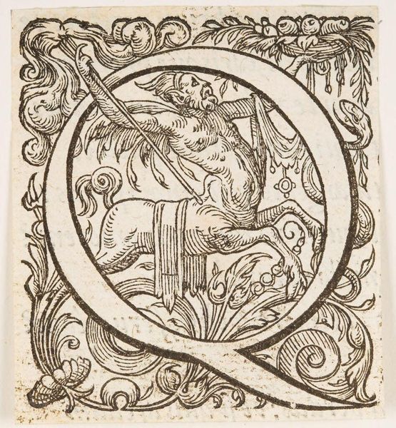 Editor: This intriguing work, simply titled "Letter Q," is by an anonymous artist. It's a very detailed image. What stands out to you about its historical context? Curator: Well, the fact that it's a letter points to a functional, public role. Consider how the printing press democratized knowledge. This initial "Q," perhaps part of a larger alphabet, reflects how art served literacy and, therefore, social mobility. Editor: So, the image isn't just decorative. It's tied to broader social shifts. Curator: Precisely. The rabbit and the seated figure--how might their symbolism be read within the context of early print culture and its audience? Editor: I hadn't thought of it that way. It's more than just an initial; it's a sign of a changing world. Curator: Exactly. Art and society, forever intertwined.