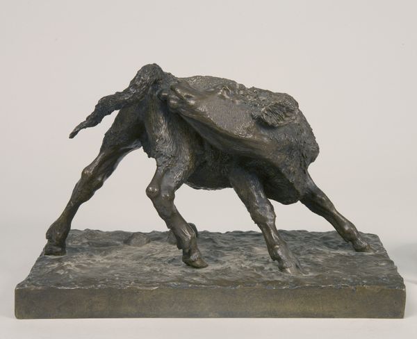 Curator: "The Empty Saddle," a bronze sculpture created by Henry Merwin Shrady around 1900, depicts a horse, head bowed, grazing. Editor: There’s such a melancholy weight to it, isn't there? The slump of the horse, the stillness...it's almost like a moment suspended in time, heavy with unspoken narratives. Curator: The lack of a rider speaks volumes. Consider the cultural context of the American West, that period. The horse alone could represent displacement, or an absent protagonist, yes? The bronze patination almost echoes the dust and grit of that era. Editor: Exactly! We must look critically at the mythology of the West. Is this a lament for a lost cowboy, or is it maybe, something more pointed: a reflection on the Indigenous communities displaced, their traditions made invisible? The empty saddle gains a potent, ambivalent symbolism. Curator: I see your point. A deeper dive would be crucial. The horse, after all, has ancient symbolic roots, a signifier of power, freedom, conquest…its domestication is intertwined with civilization itself. Shrady plays on our established ideas. Editor: And the accoutrements atop it, so still…They’re a deliberate clue, frozen signifiers— the saddle, the rifle, and the rest are powerful symbols of Western expansion, even its violence. Whose absence does the sculpture really memorialize? Curator: Shrady also appears to suggest the deep entanglement of the natural world with the harsh demands of the period. It could represent an appeal to reassess our reliance on a violent past. Editor: Art’s duty, sometimes, is to unearth complexity. What seems simple, even traditional, may ask hard questions of legacy and loss. This is precisely how “The Empty Saddle” does this work for our audience. Curator: You’ve given me much to think about, interpreting an established work like this. The dialogue shifts, but hopefully we become increasingly perceptive to it over time. Editor: That's the ideal, isn't it? Engaging actively with the past, inviting art to challenge us now. This piece deserves sustained reevaluation.