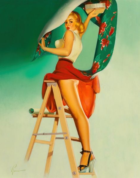 Gil Elvgren’s painting presents us with an alluring figure in a courtroom setting. The image participates in the visual culture of the United States in the mid-20th century, a time when advertising and popular media frequently employed idealized images of women. Elvgren was a successful commercial artist, whose work was featured in magazines and calendars. In the context of the post-war boom, he was one of many artists who contributed to the construction of an image of domestic bliss and feminine beauty that was promoted by advertisers. However, this created a tension between the social ideal of domesticity and the lived experiences of women at the time. Further research into advertising history, women's magazines, and the biography of Elvgren would provide more insights into the cultural meanings of this artwork and what it can tell us about the social landscape of mid-century America. The value of this kind of art lies in its ability to reflect the aspirations, anxieties, and norms of a specific historical moment.