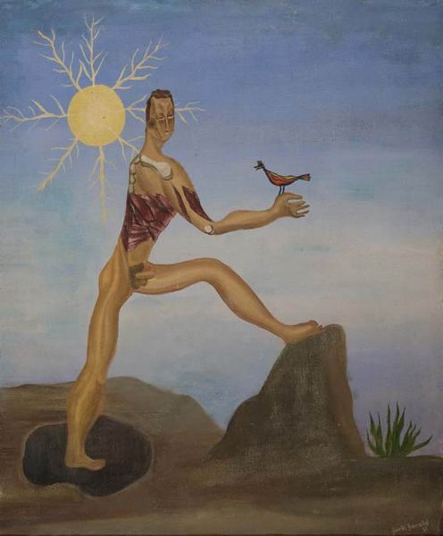 René Magritte made this oil on canvas painting called "Perpetual Motion," and I'm instantly drawn to the odd, dreamlike quality. Magritte was a master of the unexpected, and here, the smooth, almost airbrushed finish gives the scene an eerie clarity. Look at the figure. The colors are muted, but the surface is incredibly smooth. It's hard to tell what kind of brushes were used. The real kicker is the head. That gray sphere, blank and impersonal, supporting the weight of what I can only assume is the earth itself, is just so weird! The landscape is equally bizarre, with its reflection pool showing blocks and a barrel. It reminds me a little of de Chirico, but with a very different feel. Ultimately, Magritte embraces the ambiguous. Is it profound? Is it absurd? It's probably both, all at once.