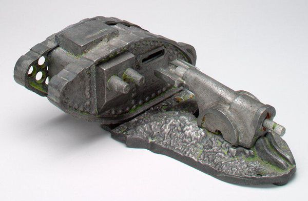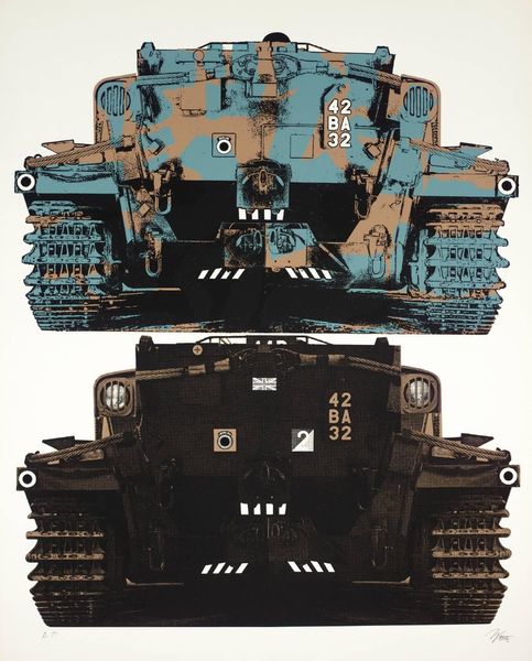 Editor: This print by Gerd Winner features a symmetrical rendering of a tank. The composition is so intricate, almost ornamental. What are your thoughts on this work? Curator: The mirroring certainly draws attention to the object's inherent geometry, transforming a war machine into a study of form. Notice how the artist meticulously renders the textures, highlighting the interplay of light and shadow. Editor: So, it's less about the tank itself and more about how it's presented? Curator: Precisely. Winner encourages us to engage with the visual elements – line, shape, texture – devoid of immediate context. The formal qualities take precedence. Editor: I hadn’t considered that approach. Thanks for illuminating the details of Winner's composition. Curator: My pleasure. It is through this intense focus on structure that we appreciate the artist's vision.