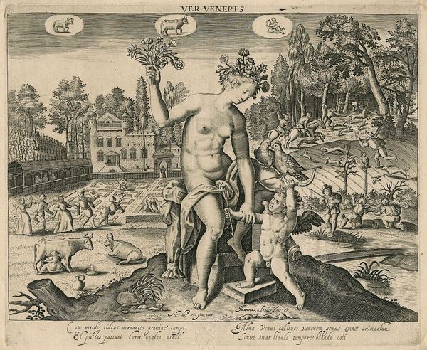 This engraving, made by Dirck Volckertsz Coornhert in the late 16th century, uses a scene of classical allegory to reflect on the state of the church. Coornhert cleverly stages the main action in the foreground: Venus, Cupid, and Bacchus cavort in front of a monastery. Here, they represent the intrusion of earthly desires into sacred spaces. The artist underscores his point with a hunting scene in the background. The overall composition leads us to question the role of religious institutions in shaping moral behavior, suggesting they have become corrupted by the pleasures of the flesh. This print offers insights into the artist's own reformist views. Coornhert rejected the dogmas of the church and his belief in individual conscience and reason is reflected in his critique of the institutions of his day. Looking at sources from the period, such as religious pamphlets and institutional records, helps us to understand the social and political context in which Coornhert produced this image. In doing so, we gain a deeper understanding of the ways art engages with the urgent issues of its time.