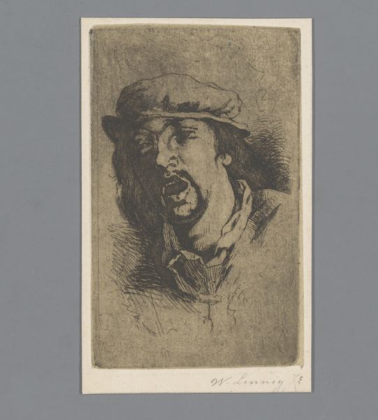 Frédérique O'Connell-Miethe rendered this small etching entitled "Portret van Maria Magdalena" in the 19th century. The image is dominated by dense, dark lines that form the figure of Mary Magdalene. Her face emerges from a sea of shadow, a stark contrast creating a deeply emotional tone. The composition is tightly focused, drawing us into the raw vulnerability of the subject. O'Connell-Miethe employs a structural technique through a network of intricate lines, almost like a web that captures the figure's essence. This formal element invites a semiotic reading, the lines acting as signs that converge to signify not just a portrait but also a psychological state. Notice how the artist challenges traditional representation; the figure appears unfinished, raw. This destabilization of conventional form allows us to ponder the nature of portraiture itself. The etching's power lies in its ability to evoke empathy through the structural tension between light and shadow. The starkness emphasizes emotional depth and suggests a broader meditation on suffering and redemption.