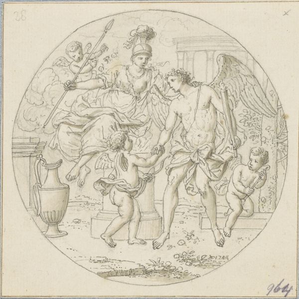 Jacob de Wit created this drawing, "Putti with Medallion," using pen and brown ink with gray wash, likely in the first half of the 18th century. The image presents playful cherubs, or putti, clustered around a medallion, embodying a lighthearted, decorative aesthetic that was highly valued in the period. De Wit was celebrated in his time for his illusionistic ceiling paintings, often featuring these kinds of cherubs, which were very popular in the decoration of private homes. The use of putti and classical motifs reflects the influence of the classical world on European art and culture at the time. The medallion itself, bearing a classical profile, reinforces this connection. The drawing, though small, suggests the larger cultural investment in classical imagery and its deployment in the service of aristocratic taste. To fully appreciate this work, consider consulting period pattern books and architectural drawings, which helps us understand the visual culture of the time and the role of drawings like this in shaping it.