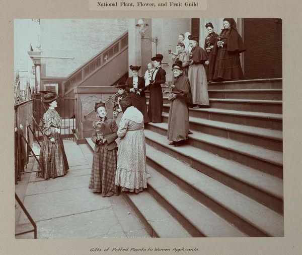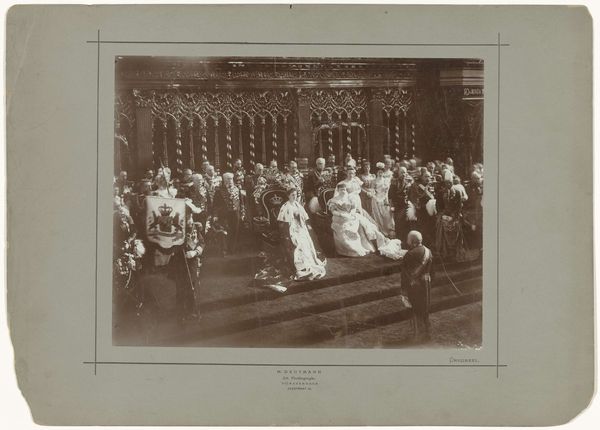Curator: This photograph by Louis Alman captures a wedding party. There's a stillness to the figures despite the obvious celebration. Editor: It feels staged, doesn't it? All the men in the back, the women arranged by height, it speaks volumes about early 20th-century societal norms. Curator: Yes, and consider the tonal range—the almost monochromatic palette emphasizes texture and form. Notice how the satin of the bride's train pools in the foreground, creating a dramatic focal point. Editor: That's where I see a problem. The whiteness is blinding. It amplifies this image's ties to patriarchal structures, where women were possessions passed from father to husband. The composition subtly reinforces that. Curator: I can appreciate that reading. However, the photograph's strength lies in its sharp details—the lace, the perfectly tailored suits. Alman understood how to manipulate light to capture the essence of these materials. Editor: And what essence is that, other than the preservation of a very specific, exclusive history? Still, the photograph is a compelling example of visual narratives and constructed identities. Curator: Indeed, there are layers of interpretation at play here.