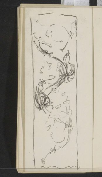 Editor: We're looking at "Band met floraal motief," a floral design sketch from somewhere between 1876 and 1924, by Gerrit Willem Dijsselhof. It's currently held at the Rijksmuseum. It’s quite delicate, like a quick botanical study done in pencil. What do you make of this initial idea? Curator: This sketch is more than just a preliminary design. Look at the labor involved, the repeated marks creating form. Dijsselhof is experimenting with the inherent qualities of graphite on paper – its ability to render both delicate lines and shaded masses. It makes you wonder about the artist's own material conditions, and who this work was ultimately intended for. Editor: That's interesting. I was just seeing a light drawing, not thinking about its creation so deeply. Why is understanding the materials and production so important? Curator: The choice of humble materials like pencil and paper democratizes the artistic process. This challenges the preciousness often associated with "high art." What does it suggest about the perceived value of design versus finished artwork at that time? This exploration would have happened behind the scenes; it is interesting to study art's means of production, labor and time behind what sometimes looks easy. Editor: I see what you mean. It's easy to overlook the artist's process, but the material and technique can tell us a lot about its purpose and audience. So this wasn't just about planning, but exploring different qualities offered by pen and ink, as opposed to more prestigious and expensive mediums. Curator: Exactly. Think about the societal implications; mass production, wallpaper industry... Who benefitted, and at what cost? And, to what extent did artistic work and skills rely on manufacturing and broader consumer needs? Editor: I've definitely learned a lot! Now I appreciate the drawing not just for what it depicts, but also as a trace of the artist's labor and its relationship to industrial production. Curator: Precisely. These "minor" works offer powerful insight.