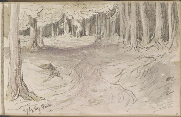 This pencil drawing of a girl sitting on a forest path was created by Bramine Hubrecht. Graphite pencil drawings like this one were often considered preparatory sketches or studies, a means to an end rather than a final artwork in and of themselves. Here, Hubrecht’s use of the pencil is front and center. Her mark-making ranges from the soft, blurred shading of the forest floor, to the firm, quick strokes that define the trees and the girl’s form. The varying pressure and angles she applied to the pencil create a sense of depth and texture, inviting us to consider the scene’s atmosphere. While pencil on paper may seem simple, it’s a key example of industrial innovation democratizing artistic practice. With mass production, graphite pencils became affordable and accessible, allowing artists like Hubrecht to capture fleeting moments and explore their creative vision with relative ease, opening up new audiences for art. Ultimately, by attending to the apparent simplicity of the materials, we can appreciate the artwork's nuanced significance.