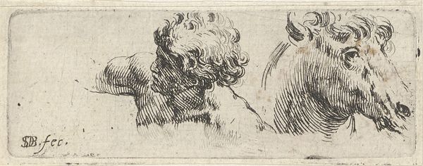 Curator: What strikes me immediately about this small pen and ink sketch, *Studieblad met twee figuurstudies* by Cornelis Schut, dating from around 1618 to 1655 and housed here at the Rijksmuseum, is its almost frantic energy, yet also a strange stillness. Editor: Yes, there's definitely something very visceral about the rendering here. The lines are so scratchy and immediate. The subjects look almost…caught. What’s interesting is the separation of those captured figures and the artificial, framed border they inhabit. Are we voyeurs? Curator: Well, study sheets like these were very common in baroque studios. Artists used them to practice depicting the human form, experimenting with different poses and angles. These nudes become tools of the trade. They are objects to be copied and refined, ultimately serving the higher goal of mastering the human body. This also means that what we see now as artistic gesture may originally have been rote studio procedure, which takes the emotion out of it slightly. Editor: I can appreciate that, but even understanding that these were for practice, I can't help but see these figures as vulnerable and unposed. The woman seated looks exhausted. She’s curled inward, while the man struggles with the physical weight and effort to reach upwards. Is that hope? Supplication? Is it all a grand performance for the divine, as many baroque subjects depict? Curator: Or are they models in repose between set changes? I suppose that, stripped of all explicit religious or mythological symbols, these images encourage different ways of seeing baroque artistic strategy itself, right? The sketchiness you’ve named, and their unfinished appearance prompts you to make assumptions and to create a narrative to which they may originally have been strangers. Editor: Absolutely! And perhaps that very quality, that openness to interpretation, makes this seemingly simple study sheet quite radical in its own way. I wonder what Schut would make of us assigning these thoughts to his sketches? Curator: Perhaps he'd laugh, recognize the spark of creativity, or perhaps not recognize the subjects in which we invest our interpretation. In either case, the work endures and asks us to bring our perspectives to it, regardless of authorial intent. Editor: Indeed. Another instance in which the viewers are the last brushstroke, I suppose.