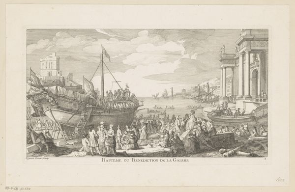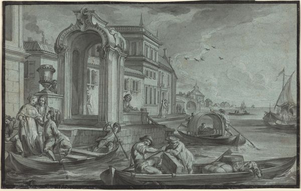 Curator: This is Johann Wolfgang Baumgartner's "Venetian Fantasy with the Dogana," a drawing in ink on paper dating from around the 1750s. It evokes a really striking image of Venice. Editor: It absolutely does. Immediately, it gives me this sensation of being a stage set. All the figures feel very performative. It's like a bustling, stylized opera. What's your take on that, looking at the scene through your lens? Curator: Well, Venice itself has always been a kind of stage, a carefully constructed backdrop for displays of power and wealth. And this drawing captures that essence perfectly. The Dogana, that customs house, is right there as a key symbol of Venice's economic strength, while those figures…their clothing is telling, isn’t it? Signifying status within that city. Editor: You’re so right! It's fascinating to think of clothing functioning as pure signal, setting you into an elaborate hierarchy the moment you step into public view. And the whole Rococo feel—it just oozes that over-the-top extravagance. But tell me, do you think there's also a sense of melancholy hiding within this picturesque scene? I feel like it has a little undercurrent of "things are beautiful, but maybe fleeting." Curator: Interesting observation! The fantasy element lends itself to the impermanent and idealistic, doesn’t it? Even as it captures the magnificence of the Venetian Republic at its height. It's a potent reminder of how these power structures inevitably shift. You can sense the fragility underneath. The dark outlines further enhance that sentiment too. Editor: True, that chiaroscuro has an interesting impact; and look at the placement of the buildings! Everything’s set apart from everything else: the campanile, the main construction... the characters become individual and isolated from one another. Well, I find this drawing delightfully theatrical. And more subtly bittersweet than I expected! Curator: A reminder that the stories behind the symbols are always deeper than the surface. Thank you for sharing your insight. Editor: It was my pleasure entirely! Thanks for unveiling more for my reflection.