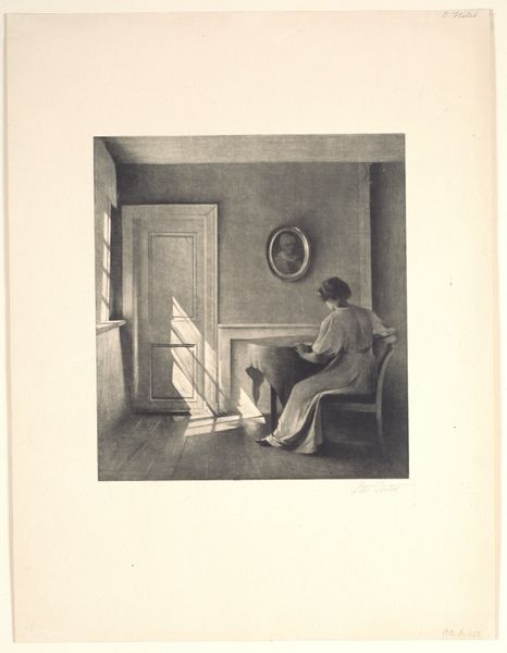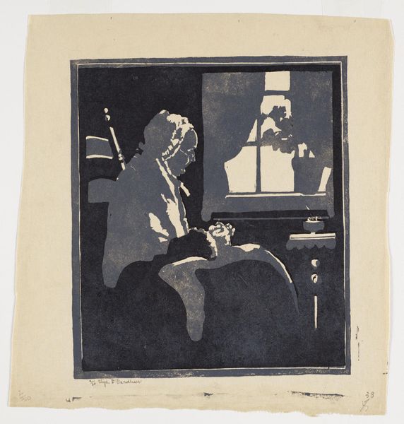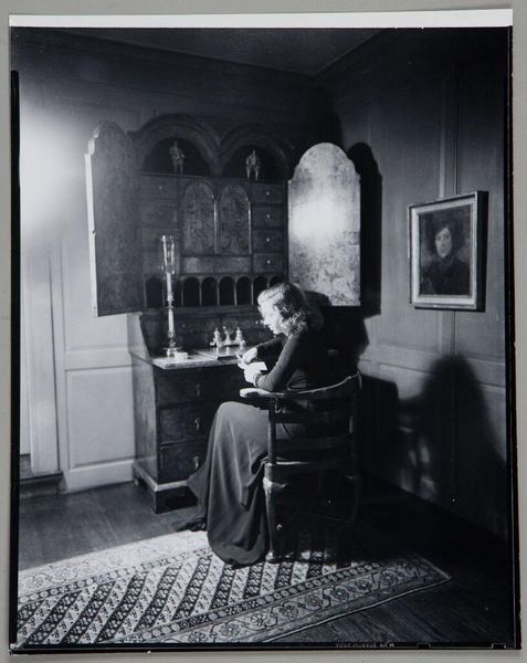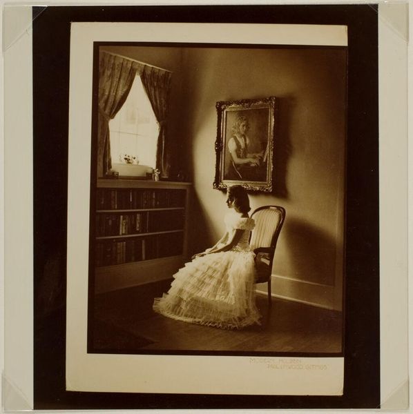 Editor: Here we have J. Jerome Hill’s gelatin-silver print, "Maud Hill," dating between 1920 and 1972. It's a very intimate portrait, I feel a sense of quiet observation. What draws your attention when you look at this work? Curator: I see this piece as a commentary on the prescribed roles of women and aging during the period. Trapped, in a sense, between domesticity symbolized by the curtains and needlepoint, and the beckoning freedom of nature, visible through the window. It subtly critiques the limited sphere afforded to women of a certain class and age. What do you make of the window's positioning in relation to her gaze? Editor: That's fascinating! I hadn't thought of it as a critique, more as just a quiet moment. The window, I suppose, does frame her longing – almost like a stage. Do you think Hill intended this commentary or is it something we project onto the image now? Curator: Intent is always a slippery slope. However, we can look at the visual language - the light, the composition - as suggestive. The framing of Maud by the window *implies* a social critique, reflecting broader feminist conversations that have been ongoing. Do you feel this changes your initial perception of the image? Editor: It definitely adds another layer. Seeing her enclosed like that, yet with a window... it shifts the tone. It's not just peaceful observation; it's a quiet resistance, maybe? Curator: Precisely. By juxtaposing intimacy with the hint of external possibilities, Hill's photograph prompts us to consider the silent struggles within seemingly ordinary lives. Editor: I see the work so differently now! I’ll remember to look for those unspoken stories within the everyday when looking at portraits moving forward.