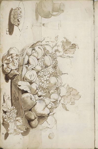 Editor: So, this is page six from "Joaillerie: Album of Jewelry Designs," dating back to 1770. It’s an anonymous drawing and print on paper, housed right here at the Met. The sepia tones and delicate floral motifs give it such a wonderfully gentle, almost dreamlike quality. What catches your eye, what whispers to you when you look at this page? Curator: Ah, whispers… precisely! It reminds me of a forgotten language, the language of adornment, the secret dialogue between wearer and object. Do you notice how the designs are not merely decorative, but rather seem to suggest movement? Imagine these as jewels dancing with light. Consider the Rococo penchant for the frivolous, the playful. Jewelry then wasn’t just status; it was flirtation, wit given form. What do you make of that bold juxtaposition – the naturalistic floral arrangement alongside what seems like…fruit, almost? Editor: I hadn't thought about it that way, seeing them almost…competing for attention on the page. The fruit, or egg-like shapes, felt a little… I don't know, simplistic compared to the super detailed flowers. But thinking of them together as part of this flirtatious game makes them so interesting. It makes you wonder who they were meant for. Curator: Exactly! We're now imagining stories, potential wearers. It's the power of suggestion, a half-told tale glittering with potential. You know, each viewing can become a personalized excavation into art and history. Don’t you agree? Editor: Totally. I came in just thinking these were some nice drawings of old jewelry. Now, they feel almost alive! Curator: And there’s the magic. Once static objects start to breathe; their story waits to be discovered.