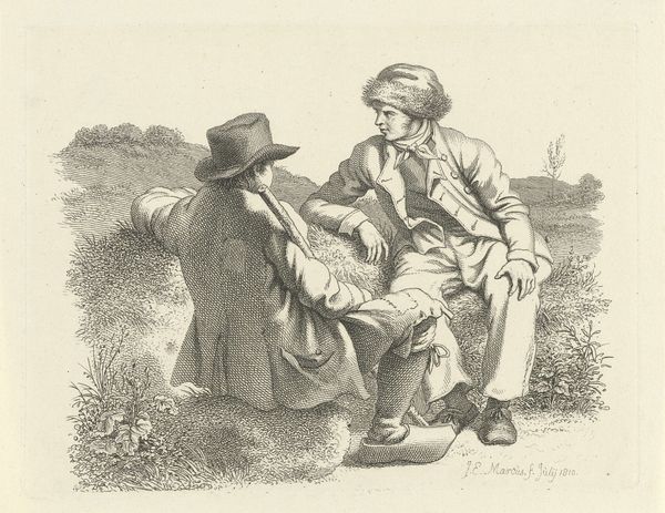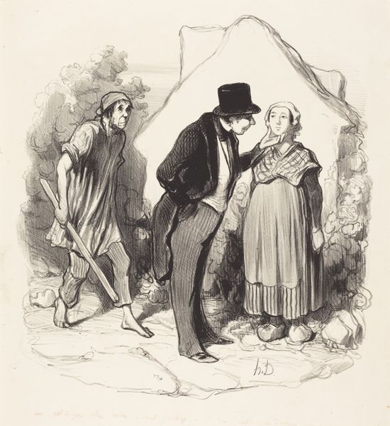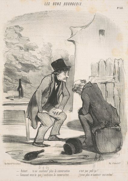 Editor: So, this drawing is titled "Monsieur voila vingt ans que je poursuis l'union de..." and it's by Honoré Daumier, created around 1846. It appears to be a pencil drawing or print of some sort. There's a real satirical feel to it, almost a dark humour in the way he’s rendered the two figures. What do you see in this piece, Professor? Curator: Oh, you've touched upon something fascinating already. Daumier was the master of social commentary, wasn't he? Notice how he uses caricature not just to amuse, but to critique. The juxtaposition of the figures – one seemingly caught up in antiquated dreams, perhaps the one exclaiming "For 20 years I persue the union!" and the other the epitome of modern, possibly apathetic, elegance – speaks volumes about societal shifts. He captures that awkward moment where tradition clumsily meets the new world order, don't you think? Like watching your grandparents try to use TikTok. Editor: I never thought of it that way, about tradition versus modernity! I was focusing on their expressions. But I see what you mean - a sort of cultural dissonance, and those lines almost feel frantic on the old man and confident on the new. Does this context influence how people at the time might have reacted? Curator: Absolutely. Back then, this would've landed as a pretty sharp jab. He's challenging the romantic notions of the past, showing them up against a more pragmatic present. Do you see how Daumier doesn't let anyone off the hook, even those in positions of power, through those piercing glances into their real personalities. This pencil allows the subtle lines and expression of something so raw! Almost unguardened... And with that, are even we are implicated through that view of social awareness that carries through centuries. The laughter isn't just at them, but at ourselves too! Editor: I do, and knowing that gives it so much more impact. So it isn’t just funny, it’s also... well, uncomfortable! Curator: Exactly! Art that doesn’t stir us a bit... it’s just wallpaper, isn’t it? And as it all comes to life through us viewing it, how fabulous! Editor: I'll definitely never see Daumier the same way again.