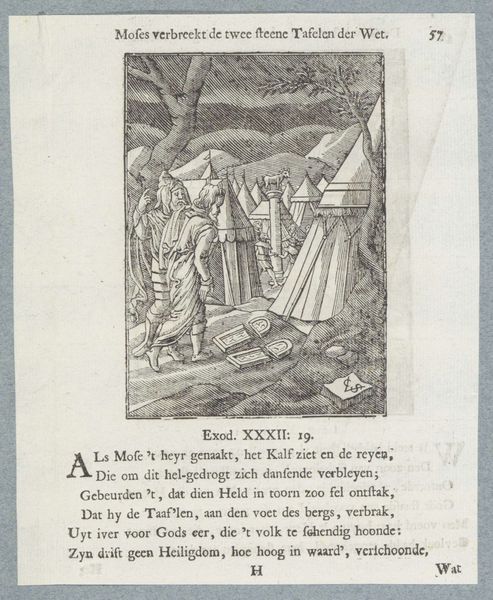 Curator: I'm immediately drawn to the textures in this engraving. The way the lines create depth in the landscape, particularly the mountains behind the figures. It’s an older print and I feel that texture speaks volumes, carrying history with it. Editor: Indeed! The work is entitled “Jakob werkt zeven jaar bij Laban” or, in English, “Jacob Works Seven Years for Laban”. Dating sometime between 1645 and 1740, this print by Christoffel van Sichem II depicts the biblical story of Jacob’s arduous bargain with Laban. What initially strikes you about the composition beyond the landscape, visually? Curator: It's all contrast. The light clothing of the figures against the darkness of the setting; it’s visually poetic in its starkness. The meticulous detail of the flock of sheep grazing on that impossible hillside—it's as if a story is unfolding right before our eyes, and, of course, it is. But beyond the literal telling, I sense a deeper symbolism at play, something about the sacrifices we make for love and devotion? Editor: Precisely! The engraving's power lies in its compact storytelling. Consider the positioning of Jacob and Laban; it highlights both negotiation and obligation. This transaction unfolds before a landscape which visually seems almost perilous, this speaks to me of commitment, perseverance. And yes, perhaps, the slightly uneven balance in this power relationship? Van Sichem subtly uses space and line to imply all these layers. Curator: Absolutely. And I notice the house almost hidden in the rocks—suggesting safety and belonging; perhaps a haven that Jacob hopes to attain. There’s even this wonderful hand-drawn type filling in details above and below, making the print feel so intimate, like a glimpse into a well-loved, carefully kept journal of parables or maybe morality plays. What do you suppose the audience that consumed these would get out of a scene like this? Editor: This print allows for an entry point, in visual terms, into religious education through narrative artwork, common themes found during the Dutch Golden Age. This engraving captures the essence of a biblical tale within a meticulously designed frame—a window into devotion, duty, and the tests of time, and I feel that so richly displayed today. Curator: Well put. To spend time reflecting on these layered considerations is why art continues to challenge, inspire, and enchant.