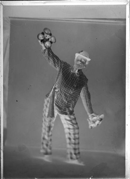 Curator: Elsa Dorfman’s "Kristalleon. Big Apple Circus. April 14, 1993” shows a figure in full harlequin costume, balancing a pyramid of colorful cocktails. It strikes me as melancholic, almost otherworldly. Editor: The photograph captures a moment of performance, yet it also speaks to broader themes of identity and spectacle. The masked figure, adorned in diamonds, reminds me of societal expectations and the performative aspects of self. Curator: I see that, but I'm also drawn to the fragility of the crystal glasses, and the uncertainty of performance, that precarious balance. It's a moment caught in time, just before the inevitable spill. Editor: Yes, and within that precarity, we can also read the anxieties of a society obsessed with control and perfection, mirroring the masked figure's tight grip on the tray. Curator: I guess I'm reminded how art can be as playful as it is profound, like life itself. Editor: Absolutely, prompting us to consider how we all navigate our roles on life's grand stage.