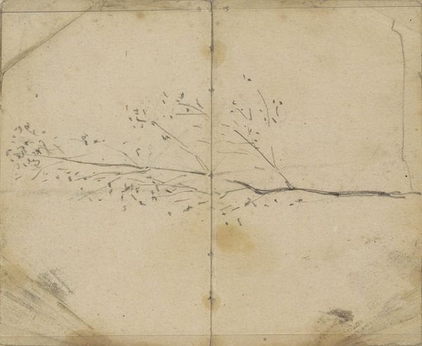 Editor: This drawing, "Vijf Bomen," or "Five Trees," created with pencil between 1881 and 1883 by George Hendrik Breitner, has a raw, almost fragile quality. I feel like I'm looking at something fleeting, a thought jotted down before it disappears. What do you see when you look at this piece? Curator: Fleeting is the word, isn’t it? It's funny how these trees, so stark against the page, seem to be whispering secrets about impermanence. I like to imagine Breitner out in the fields, maybe battling a bit of a breeze himself, quickly capturing this vision before the light shifted or the moment was lost. Have you ever tried drawing outside? There's this vulnerability of working right there in the teeth of the world, feeling the shift of light against the clock of passing time. Editor: I haven't drawn much outdoors, mostly studio work. Is that why the style looks… unfinished, almost? Curator: "Unfinished" maybe isn't quite right. "Immediate," perhaps. He's capturing an impression. Breitner, though often linked with Impressionism, always struck me as more rugged, less interested in hazy light than the raw骨骼 of a scene. Consider those stark lines, those economical strokes! It feels less about objective accuracy and more like a gut feeling, rendered visible. And those stains! They remind me that artworks also live lives – things happen to them. Like us. Editor: So, it's not a perfect picture, but an honest record? Curator: Exactly. Isn't there something liberating about that? To embrace imperfection, the accidental beauty of being in the world and trying to grasp it, even when – maybe especially when – you fail? It's a sketch that whispers "I was here" instead of shouting "Here's perfection." Editor: I never thought of it that way. I’m seeing how its simplicity actually gives it more power. Thanks! Curator: The pleasure is mine. Art, at its best, shows us a new way to see; and when it connects personally, well, isn't that just brilliant?