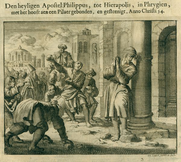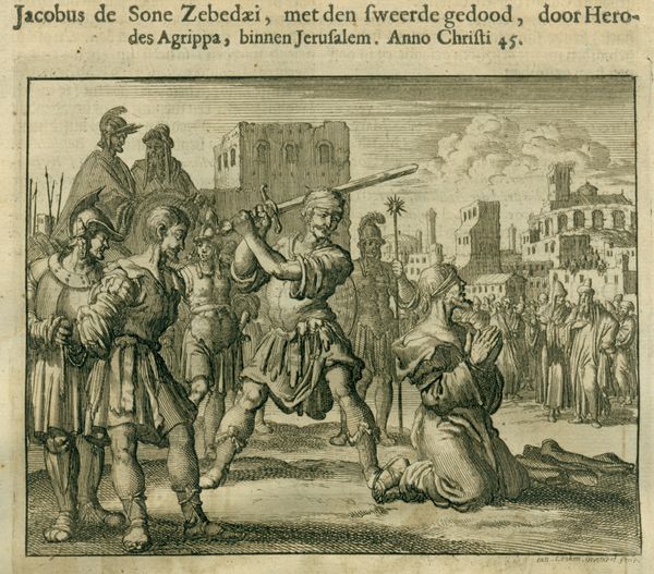 Jan Luyken made this print, "13 Year Old Pelagius Martyred, Cordoba, Spain, AD 925," using engraving, a process with a rich history. The fine lines you see are the result of Luyken meticulously carving into a metal plate, likely copper, with a tool called a burin. The depth and density of these lines create the tonal range, from light to shadow, giving the scene its dramatic intensity. This was a highly skilled practice, demanding patience and precision, part of a long lineage of printmaking used for both artistic expression, and disseminating information. Engraving allowed for relatively mass production and distribution of images, crucial for spreading religious and political ideas. Consider the labor involved, not only in the artist's work, but also in the paper production and the printing process itself. These prints were commodities, and part of a growing culture of consumption. Ultimately, the artwork’s power lies in its connection to the social and political context of its creation, reminding us that art is not separate from the world of labor, politics, and belief.