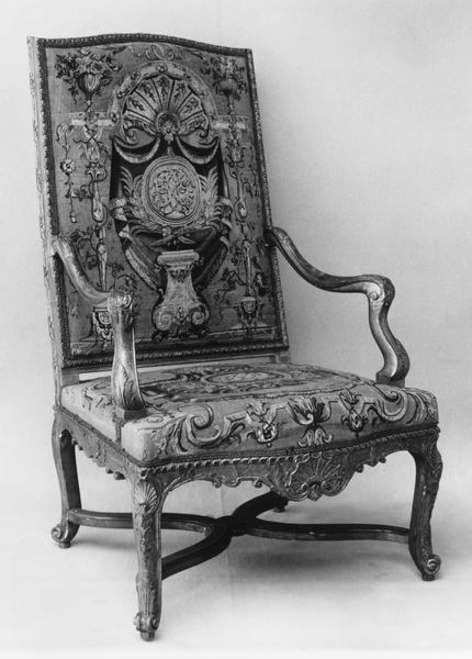Editor: This is an "Armchair (fauteuil)," dating back to 1700-1725. It’s currently housed at the Metropolitan Museum of Art. It’s a mix of carved wood, textile, and what looks like some form of needlepoint or tapestry. It has a surprisingly regal yet comfortable look. What can you tell me about this piece? Curator: Look at the labor involved. Consider the carving of the wood frame, the sourcing and preparation of the materials, the skilled weaving of the tapestry panels. It represents a significant investment of time and skill. Who benefits from this production, and under what conditions? Editor: That's a great point, it is far from something mass-produced! Do you think the Rococo style emphasizes the material value, or tries to disguise the labor behind it? Curator: I'd argue the Rococo, while ornate, reveals more than it conceals. The conspicuous consumption is the point. Each flower, each bird motif, woven with such care. They are asserting social standing and participating in what could be considered "conspicuous consumption." The texture and richness of the fabric speak volumes about the chair’s intended environment. Editor: That’s fascinating. So, it's not just about aesthetics but also about the societal structure that allowed for such intricate creations. Curator: Exactly! We are also talking about class, right? These chairs provided employment opportunities to local communities, or specific workshops specializing in textile arts or carpentry. We should ask questions about how materials shaped the development of different styles of craftsmanship in particular regions, in the wake of specific societal patterns. Editor: That perspective makes me see it as much more than just a pretty chair! Curator: Precisely. Analyzing it this way gives a clearer idea of its role within the economic and social context of its time.