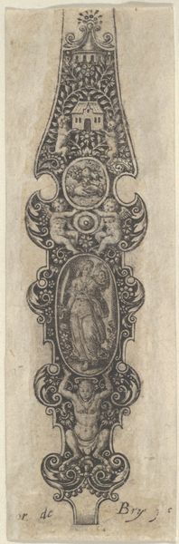 Curator: This engraving, made sometime between 1530 and 1573, is entitled "Pendant Design with Mars Standing in a Niche" and attributed to Jan Collaert I. What is your first impression? Editor: It's intricate, isn't it? The overall effect is very... regal, but also rigid. A lot of tightly controlled details, especially surrounding the central figure of Mars. I imagine it feels like power but it also makes me feel somewhat suffocated. Curator: It’s a potent emblem of power, alright! Note how the image of Mars—the Roman god of war—is framed. He's almost trapped within this highly ornamental niche, evoking a sense of the warrior contained, or perhaps glorified. He is quite literally placed upon a pedestal within a jewel. Editor: Exactly! It's that tension between freedom and constraint that’s so interesting. I wonder, what purpose does the god serve here other than being a symbol of warfare and status? Curator: The image draws upon centuries of cultural memory where Mars stands for military might, yes, but also civic order, especially in the Renaissance. These pendants, crafted from precious metals, would have been worn to signal the wearer’s allegiance and authority. Perhaps the pendant was a charm used by an officer of the guard. Editor: I suppose, but couldn’t it also represent more oppressive aspects of authority: state sanctioned violence? I mean the very presence of Mars normalizes that. Curator: Indeed, the glorification of Mars could easily endorse violence. But consider the craft. Each element—the ornate swirls, the symmetrical drops, the controlled lines of the engraving itself— speaks to a desire to bring order to chaos. Metal and prints like these played an important role in shaping societal perceptions of masculine authority in that historical moment. It is difficult to untangle these contradictory notions. Editor: It certainly gives us much to think about, especially as we view these forms of art in a contemporary setting! Curator: Precisely! And the endurance of such potent symbols across the ages invites us to explore the myriad layers of cultural significance embedded within them.