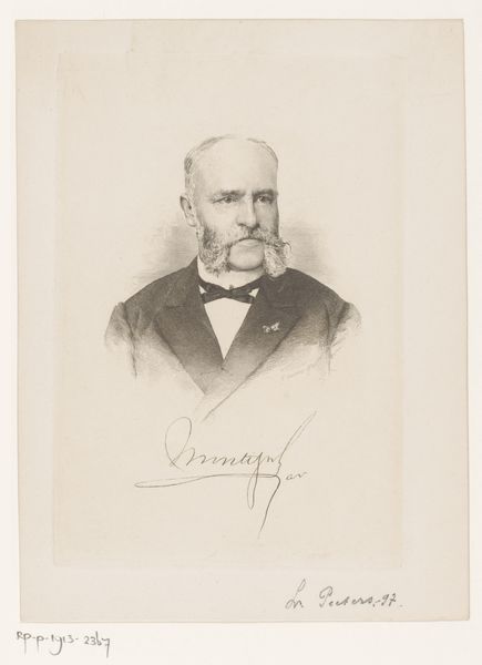 Curator: So, we have here Louis Peeters’ “Portrait of an Unknown Man, Possibly Montigny,” created in 1897. It’s a pencil drawing on paper, a study in serious concentration, wouldn’t you say? Editor: It certainly evokes that air. Immediately, I’m struck by the precision of the strokes, how diligently the artist has rendered texture, especially within that magnificent, sculptural facial hair. One wonders how many pencils were sharpened to achieve this density. Curator: True! And those meticulously detailed whiskers almost upstage the gaze, which I find to be the true focal point. I get a sense of him seeing everything, yet revealing nothing. I wonder what he thinks of us now? Editor: Considering this was made near the close of the 19th century, the labor embedded within such a portrait speaks to broader shifts in artistic production. While academic portraiture upheld status, a work like this seems to hint at a tension between accessible reproduction and exclusive commissioning. What level of luxury was involved? Curator: Perhaps Peeters captured the subject just before a pivotal life change, standing at the precipice of something big or perhaps…just caught him on a Tuesday. To be serious, while the labor involved and socioeconomic contexts do matter immensely, it's important to also recognize that maybe Peeters was just having a particularly engaging Tuesday, himself, drawn in by the quirks and lines that comprise another human's story. Editor: You make an important point about not diminishing creative curiosity. Thinking about access—pencil, paper, the time— it feels less overtly exclusive than, say, oils, but still speaks volumes about the structures that facilitated artmaking, or the pursuit of certain subjects at that time. Even ‘being seen’ then had levels of privilege attached. Curator: So well said, thinking about the level of privilege in being observed! And in being captured... So next time we stroll the boulevard or even visit an ancestral home, it would behoove us to recall this portrait and to also see, capture, and immortalize those figures so often unregarded, yes? Editor: Absolutely! Because, in looking more closely at material histories, we start to see the subtle architectures that uphold or exclude…