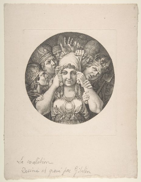 Louis Léopold Boilly created this print, "Deugdzaam meisje ontvangt een rozenkrans," which translates to "A Virtuous Girl Receiving a Rosary," during a time of social and political upheaval in France. Boilly’s work engages with the concept of the "virtuous girl" popular in the late 18th century. It reflects the era’s complex negotiation of morality and class. The central figure, adorned with flowers, embodies innocence and purity, ideals often imposed upon young women of the time. Yet, the surrounding figures, with their varied expressions, hint at the social gaze and expectations placed upon her. This piece prompts us to consider how society constructs and celebrates female virtue and the pressures of those ideals. The girl's demure posture and downward gaze speak to the limited roles prescribed to women, while the artist’s choice to depict this scene suggests a commentary on these social norms. It's a delicate balance between admiration and critique, inviting us to reflect on the emotional and societal implications of virtue.