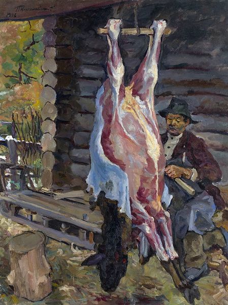 Editor: Here we have "Woman Slaughtering Hens" painted by Jacek Malczewski sometime between 1895 and 1899. The medium is oil paint and there's something incredibly visceral about the subject matter and the way it’s rendered, quite confrontational actually. What strikes you most about this piece? Curator: Well, putting aside the shock value for a moment, it's important to consider how Malczewski is portraying rural labor. Slaughtering livestock was and is a mundane, everyday activity for many. I wonder, how does Malczewski elevate or perhaps even aestheticize this task within the social context of his time? This wasn't destined for a farmhouse wall; this was going into a gallery, inviting urban audiences to contemplate a very different world. Editor: That’s interesting. So you are suggesting he is making a commentary of the public role of this type of genre painting? Is he perhaps trying to create a dialogue about class differences or rural versus urban existence? Curator: Precisely. Consider the composition - a somewhat idealized woman, a classical composition against this rather grim, earthy reality. Also, Malczewski was known for his symbolic paintings. Might we be reading deeper symbolic meanings into the hens themselves, beyond just the daily grind? Editor: So, the public's consumption of this image turns the everyday slaughter into something almost… mythical? It really makes me think about the distance we have from our food sources today. Curator: Yes! Malczewski plays on that distance and that desire to consume what the countryside has to offer while, simultaneously, wanting to avoid confrontation with that reality. He turns a mirror to his audience and to the art institution, prompting reflection on societal values and how those values are portrayed, interpreted and perhaps even exploited. Editor: That adds a completely new layer of interpretation! It's definitely more than just a scene of rural life, isn't it? I’ll definitely be rethinking the painting in relation to its exhibition context now.
