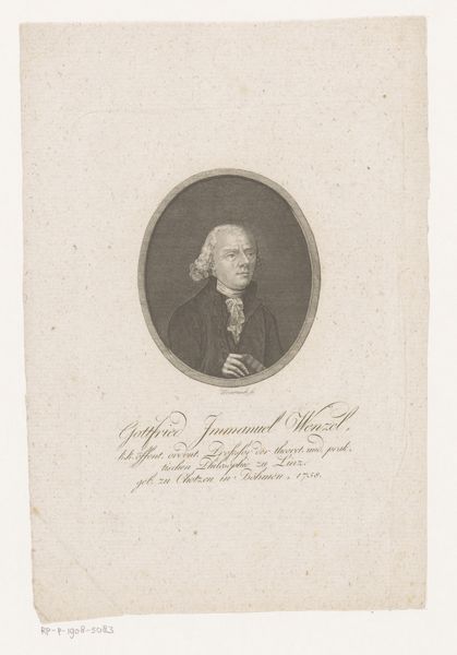Johann Gottfried Schmidt made this portrait of Josias Friedrich Christian Löffler with etching and engraving techniques. The print’s fine lines speak to the engraver's skill. Notice the tiny, deliberate marks that build up to create tone and shadow, from the delicate rendering of Löffler’s powdered wig to the subtle gradations on his face. Printmaking was a skilled trade, demanding years of apprenticeship to master the use of burins and acids. It’s easy to overlook today, but prints like this were crucial for disseminating images and ideas widely. Consider the social context: this portrait was likely commissioned by or for Löffler himself, a marker of his status and intellectual standing. The act of creating and circulating such an image reinforced social hierarchies. So, next time you see a print, think about the labor and skill involved, and its role in shaping public perception. It’s a reminder that even seemingly simple images carry layers of social and cultural meaning.