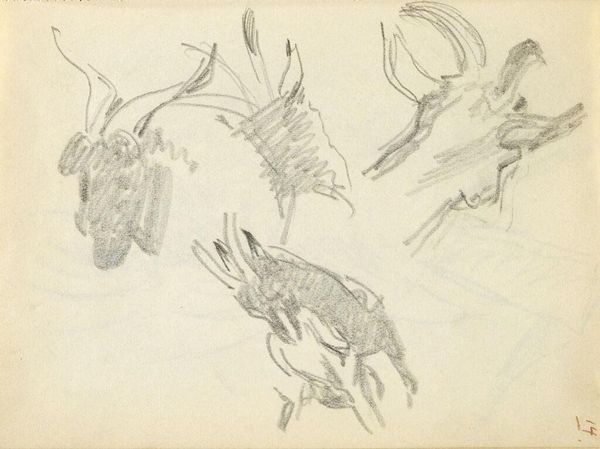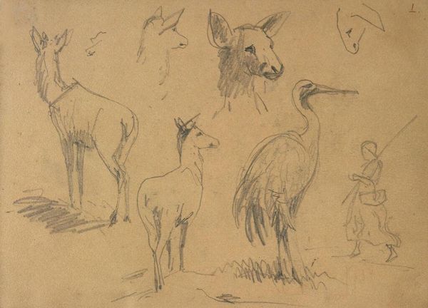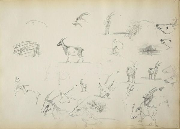 Curator: This study sheet presenting several depictions of deer was produced by Guillaume Anne van der Brugghen, sometime between 1821 and 1891. Editor: It’s…delightful! Honestly, it gives me the impression of stumbling upon a particularly charming page from a naturalist’s journal, a little window into their world. It’s got such a breezy, whimsical quality to it. Curator: Van der Brugghen captures something about movement in these animals, especially considering that these sketches were made using just pencil and paper. Notice how he explores the deer from different angles and orientations, including even some that are less conventional. Editor: You know, I find something so tender about how he renders them. There's this sort of playful innocence captured in the scratchy lines that seems to give real life to the subject. It doesn’t feel staged. I almost get the sense that he was actually in the field. Curator: That "in the field" experience is quite telling when it comes to analyzing nature studies like this. Often in 19th-century art, portrayals of animals reflected social and philosophical views about the natural world, where an increased focus on naturalism coincided with expanding colonial interests and scientific exploration. The animal body became something to examine, document, and ultimately, possess knowledge of. Editor: Huh. Well, all I know is that I wouldn’t mind having this hanging up on my wall! I like the way it invites me to simply pause and smile, and I think there's something wonderful about an artwork that encourages you to do that. It’s almost…meditative? Curator: Perhaps the sheet could be examined under a feminist lens. The intimate attention to these creatures might reflect a deep interconnectedness between humans and non-human animals, disrupting traditional hierarchies of power and offering nuanced approaches to multispecies relationships and interdependency. Editor: Whatever deeper meaning may exist, to me, these deer frolicking across the page feels like an affirmation of pure, unadulterated joy. If art can do that, then, mission accomplished.