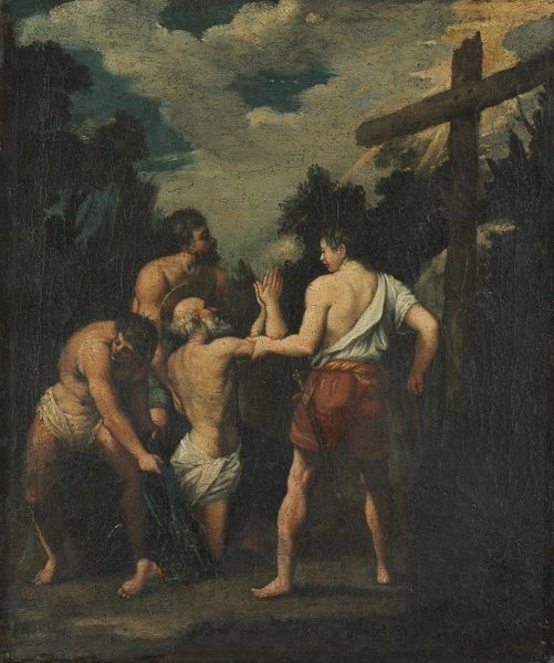 Curator: This oil painting, attributed to Francesco Solimena, depicts "Noli Me Tangere." Editor: Immediately, I’m struck by the swirling drama, like a baroque hurricane. The way the light catches the figures pulls you right in. Curator: Yes, Solimena really leans into the theatricality. This scene captures the moment in the Gospels after the Resurrection when Mary Magdalene encounters Jesus, but doesn't recognize him at first. "Noli me tangere" translates to "Touch me not," Jesus's words to her. Editor: You can almost feel her desperation in the painting; reaching, pleading. There is such pathos, with that little container of burial unguent left aside. A world upended, and her own perception challenged. Did it not strike the artists as peculiar to give the most importnat, revelatory discovery about someone's life and death to a woman in his time? Curator: Her encounter carries incredible weight for us, but there is some thought that by painting the drama between Mary and Jesus, the painting offers an ideal view into not only his role but her part in history to come. The style adheres closely to baroque conventions, prioritizing the emotional experience and clarity, the "narrative" which is central in many artistic interpretations of this period. Editor: Right, the drama overrides any subtlety. Even the angels above, gazing down, look a little too much like gossipy cherubs rather than divine witnesses. Does this portrayal say more about Baroque ideals than spiritual truth, do you think? Curator: Well, Solimena's style certainly emphasizes the spectacular. Art's public role in the Baroque era was often about communicating specific messages. I also feel this image speaks to the power of the institutional frameworks shaping even a moment such as this; commissioning religious works for certain settings certainly directs how artists interpret spiritual experiences. Editor: It’s fascinating to consider how Solimena translates faith into such a visceral, human moment. This wasn’t just theology to him; it was a story, with Mary Magdalene at the very heart. Curator: Agreed. “Noli Me Tangere,” when approached this way, becomes more than an artistic and theological piece – but a reflective consideration about the perception of a historic figure in this particular age.