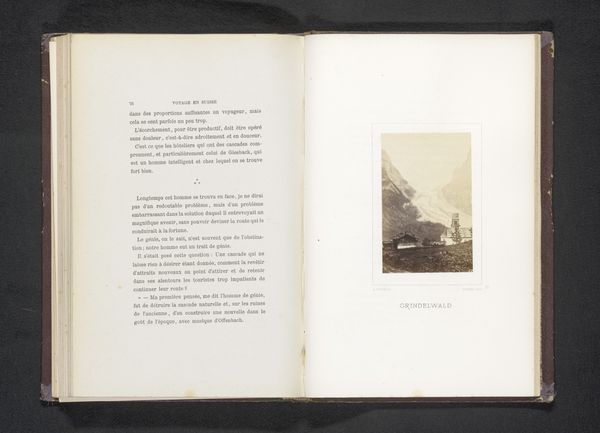Editor: This is a photograph entitled “Gezicht op Interlaken” attributed to Louis Ghémar, made before 1868. It seems to be an albumen print from a textile. It has an austere quality, showing this muted view within the pages of a book. What do you see in this piece? Curator: I see more than just a landscape; I see a reflection of the burgeoning tourism industry and its impact on representation. Photography at this time served not just to document, but also to construct a certain ideal of the "picturesque" for consumption. Who benefited from the mass consumption of these images of Switzerland, and what cultural narratives were being reinforced? Consider who has access to that tourist industry. Editor: That's interesting. It's easy to just see a pretty landscape, but you're suggesting there are deeper social and economic factors at play. Curator: Precisely. Think about the very act of "collecting" these landscapes – how does that relate to colonial modes of thinking? Also, where does this image circulate? Being placed in a book makes it part of a much larger textual narrative. Is that narrative equitable or just? Editor: So, the image isn't just about the place itself, but also about how that place is being used and perceived within a specific historical context. Curator: Exactly. And by whom. Questioning those power dynamics, and examining art's relationship to them, reveals a far richer understanding of this seemingly simple landscape. Do you think viewing art like this can help with contemporary social issues? Editor: It's empowering to consider all those points about visual consumption, which are still relevant now. Curator: Agreed, it encourages a more conscious and critical engagement with the visual world around us, both past and present.