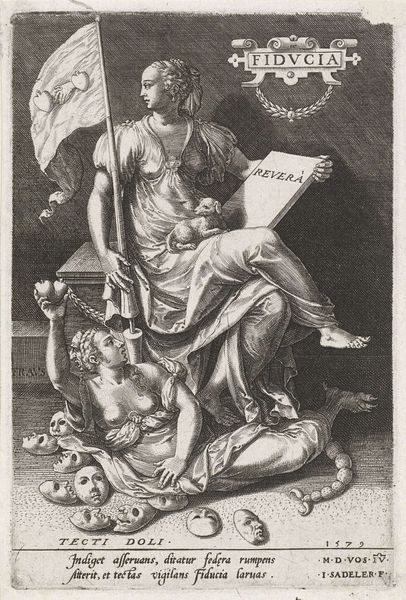 Curator: Jan van Somer’s engraving, dating somewhere between 1655 and 1700, depicts a rather… contentious domestic scene titled "Socrates and Xantippe". Editor: My immediate impression is less historical reverence, and more a spectacle of dominance. The stark contrast between the near-nude Xantippe riding Socrates, wielding a rather cartoonish bladed weapon, it’s… bold, to say the least. Curator: The image certainly plays into long-standing tropes about Xantippe, Socrates’ wife. Historical accounts, likely colored by misogyny, portray her as a shrew, a constant source of aggravation for the philosopher. The engraving then seems to visualize that narrative. Editor: Absolutely. The symbols are blatant, almost comical. Socrates, the wise philosopher, is literally brought to his knees, weighed down. The weapon, and the classical drapery hints at an Amazonian warrior… Curator: Precisely! These kinds of works reflected very clear social mores. They warned about powerful women who overstep their roles, threatening the patriarchal order. Note the bookcase behind Xantippe: classical learning that’s about to come tumbling down? Editor: Exactly. Even her near nudity is telling. The female nude, outside of purely religious contexts, served to expose women as carnal creatures, dominated by earthly appetites that must be controlled by the reasonable man. But… is it possible to read against the grain here? Curator: You mean see something other than what I am pointing out? Perhaps Xantippe here is asserting herself against an established order that had been suppressing female voices and agency? Editor: Perhaps… Or maybe she simply reminds us that even the greatest minds have their moments of earthly challenge. It is refreshing to see the "wise old man" with egg on his face. Curator: Well, whatever one chooses to read into the artwork, the lasting legacy here demonstrates just how complicated the battle between sexes is. It is definitely on display here. Editor: I would have to say that I leave this engraving viewing Xantippe’s figure and the context in new light and understanding the importance of multiple vantage points.