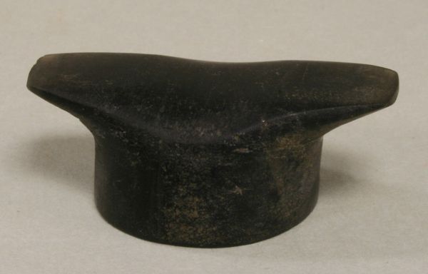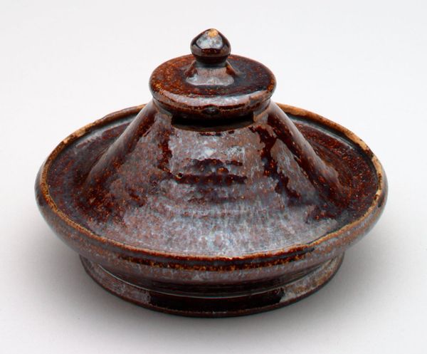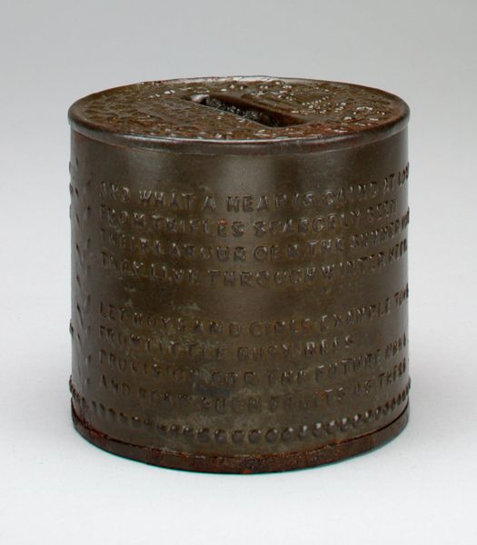 This diminutive still bank, titled "Lincoln High Hat (Pass Around the Hat)," resides in the Minneapolis Institute of Art. Its anonymous creation invites contemplation on form, function, and historical echoes. The bank's dark, patinated surface gives it a weighty presence despite its small size. The piece is dominated by two shapes; a cylinder for the body of the hat and the broad oval which forms the brim. There is a clear horizontal and vertical division to the composition, as well as textural contrast which invites a semiotic reading: the smooth cylindrical body in contrast to the inscription around the coin slot on top. The hat, an object historically associated with status and ceremony, is here refigured as a receptacle for savings, suggesting themes of aspiration and social mobility. The artwork prompts us to consider the interplay between mundane, functional objects and the broader cultural narratives they evoke. It functions as a symbolic repository, raising questions about history, and the values we assign to objects.