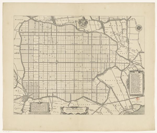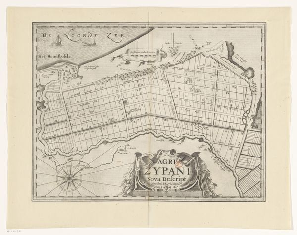 Curator: Take a moment to study this engraving from sometime between 1617 and 1662: a "Kaart van de Zijpe- en Hazepolder," or map of the Zijpe and Hazepolder. The printmaker was Pieter van der Keere. Editor: I’m immediately struck by the ordered quality of this landscape! From above, the waterways form sharp divisions across the territory. But look closer and one will note all sorts of small symbols and marks! Like an architect's initial vision of their grand construction—linear, practical, and strangely… fragile. Curator: The technique of engraving means a lot of planning. The marks are deliberate, reflecting a carefully organized agricultural region made from drained wetlands. We're witnessing not just land, but a landscape manufactured through enormous physical and organizational labor. Think of the tools and processes involved. Editor: Exactly! A landscape born from sheer force of will! The neat parcels, the imposed grids. Yet, as a drawing, it feels almost playful to me—a miniature world. The artist must have climbed up the tallest point of the Zijpe- en Hazepolder to feel at home, but one also needs to appreciate the physical exertion and social infrastructure of their enterprise. Curator: This piece shows not only artistry, but a complex engagement with territory and authority—a tangible way the Dutch Republic organized itself. The map served functional and symbolic purposes, and, in a sense, justified control of this region. What is most important to retain, then, is the labor that made it feasible. Editor: So very true! Perhaps we need to approach these old treasures not as curiosities but blueprints from people once as vigorous, flawed, hopeful, and ruthless as us. What does the map whisper about lost languages? What forgotten feelings might the picture restore to consciousness? Curator: Looking at this work and the way it presents information offers new appreciation for historical shifts in both visual communication and landscape manipulation. Editor: I agree—thanks for shining a light on this one! The map now inspires some very poignant reflections!