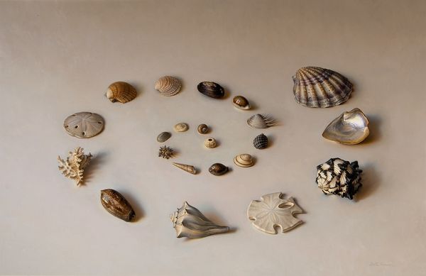 Scott Fraser created this still life composition, titled Mt. Desert Spiral. Here, meticulously rendered objects are arranged in a clockwise spiral that leads our eye into the center of the canvas. This arrangement is almost clinical, yet there's an undeniable warmth that emanates from the objects themselves. Fraser masterfully plays with our perception of space and form. Each object, carefully chosen and placed, becomes a signifier. The spiral itself, a universal symbol, evokes ideas of growth, evolution, and the cyclical nature of time. The objects, mostly organic, suggest a connection to the natural world, perhaps even a personal narrative linked to the artist’s experiences in Mt. Desert. Note the variations in texture and tone—rough stones against smooth shells, the matte finish of the wood contrasting with the sheen of the feather. This contrast encourages a dialogue between the objects. Ultimately, Fraser's precise arrangement isn’t just aesthetically pleasing; it’s an invitation to contemplate the relationship between nature, representation, and the very act of seeing.
