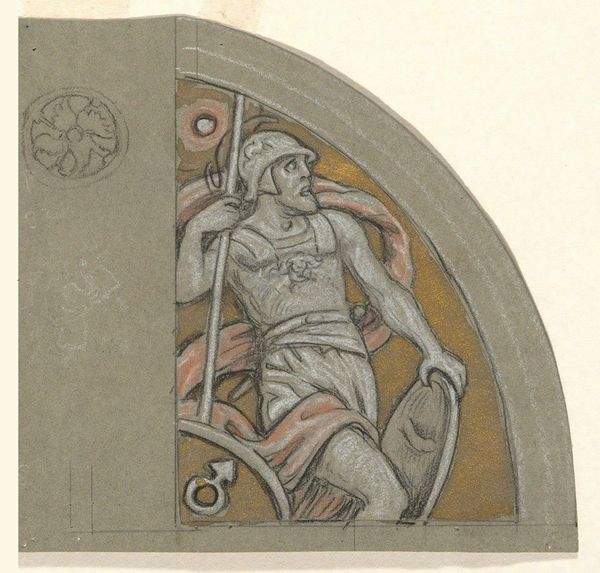 Editor: This is "Study for Mercury," created around 1893 by Elihu Vedder. It looks like a preliminary drawing using pencil and colored pencil, maybe for a larger mural? I’m struck by how dynamic the figure feels despite being a relatively simple sketch. What jumps out at you? Curator: The energy is infectious, isn't it? Vedder was diving deep into Symbolism then, aiming for emotional and spiritual resonance beyond mere representation. Notice how Mercury isn't just standing; he's captured mid-flight, his caduceus practically buzzing with energy, ready to go on a magical adventure. Vedder probably felt this project deeply; do you sense he may have imagined being that messenger god, flitting between realms of thought and existence? Editor: That’s a beautiful thought. The Symbolists were all about those hidden meanings, right? I hadn't considered the flight as a metaphor itself. So, it’s not just about Mercury being a messenger. Curator: Precisely! Think about what Mercury, as a figure, *means*—swiftness, communication, transition. Vedder is less illustrating a myth and more embodying the very idea of transformation and delivery. Perhaps it felt incredibly empowering at a personal level. Editor: The placement in a lunette shape too—it feels heavenly, like something glimpsed above. Curator: Indeed! These cropped forms themselves imply grand narrative beyond that is merely glimpsed, something sublime or heavenly. Also it would be interesting to delve into possible classical and Pre-Raphaelite inspirations, as those blend in that period in peculiar and evocative ways... Editor: I'll have to look into that, thanks. Now I see so much more than just a sketch; it feels alive. Curator: Exactly. Vedder wanted us to *feel* Mercury, not just see him, as we ourselves attempt flight, of meaning and discovery. I know I certainly do!