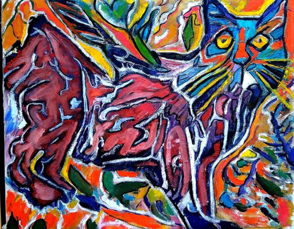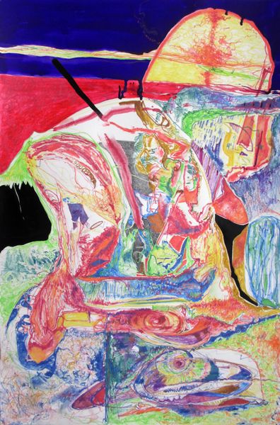 Editor: Here we have *Amour de feu* by Cricorps, created using acrylic paint. It feels almost violently passionate, like a raw, exposed nerve. What visual elements stand out to you most? Curator: Immediately, I am drawn to the dissonant harmony of the color palette. The juxtaposition of the fiery reds and oranges with the cooler greens and blues creates a visual tension, a dynamism that activates the entire picture plane. Notice how the artist doesn't blend these colors in a traditional way but instead applies them in bold, separate strokes, heightening this sense of friction. Editor: Yes, the brushstrokes feel so deliberate, almost aggressive. Is the lack of blending a conscious choice, do you think? Curator: Precisely. Consider how this technique denies the eye a comfortable resting place. The visual texture is constantly shifting, pushing and pulling the viewer's attention across the canvas. We see this same type of fragmentation also within cubism. Does the semiotic potential then become obvious? Editor: Absolutely, there's a lot of visual conflict here! It almost seems like the painting itself is resisting interpretation. Curator: Precisely! This resistance, this foregrounding of the material and the process of creation, is key. Notice also the way the composition avoids any clear focal point. Where does the eye truly rest? The 'figure,' if we can even call it that, seems to dissolve into the surrounding space. Editor: I see that now. It makes you really question what you are looking at, almost like deconstructing the image in your mind. Curator: An astute observation. This dismantling of form serves to prioritize pure sensation and the raw energy of the artistic gesture over any clear representational content. Consider then, what our new understanding of these images should allow. Editor: I never thought about approaching it from the sensation of the process itself! I’ll definitely look at abstract paintings differently now. Curator: A pleasure sharing some views on Cricorps’ approach. It’s always rewarding to analyze beyond face-value observations, especially where technique dominates the composition.