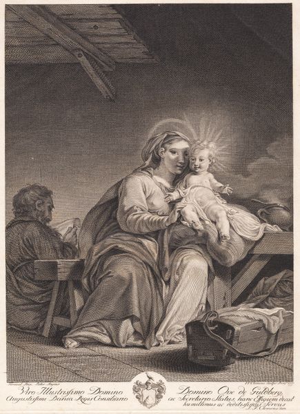 Curator: Welcome. Today we're looking at Claude Mellan’s engraving, "Holy Family (Repos pendant la fuite en Égypte)," created in 1635. It depicts a moment of respite during the Holy Family's flight into Egypt, an important visual theme of the Baroque period. Editor: It’s like stumbling upon a quiet moment in a play. Everything feels paused. The landscape itself looks etched with their weariness—as if the very stones are sighing with the weight of the journey. Curator: Indeed, it's a scene rich in symbolism, showing not only a family fleeing persecution but also the hope and quietude of faith amid turmoil. The choice of engraving allowed Mellan to distribute this image widely, touching diverse audiences with a message of solace during politically tumultuous times. Editor: The burin work is incredible! All those lines, crisscrossing and dancing to create light and shadow, are giving it so much energy even in stillness. Is that light catching Mary’s face and little baby Jesus… is he sleeping? Curator: That's an interesting observation. Consider the formal elements – the composition is carefully constructed to guide the viewer's eye, focusing our attention first on Mary and Christ, then expanding outward to include Joseph and the broader scene of their refuge. The donkey grazing in the corner suggests the mundanity of their travel but also symbolizes patience and service. Editor: It's as though Mellan wants to pull us in. Make us remember the real, human side of the Holy Family: Tired, maybe even hungry, but cradled in the heart of some greater peace. That engraving in itself, those simple lines, become something deeply human. Curator: Absolutely. It reminds us that Baroque art wasn’t just about grand gestures and theatrical displays; it could also be about finding divinity in the everyday, making religious narratives more accessible and relatable to the average person. Editor: Being here and talking, and taking a pause is just as important for us as the historical or societal. The work almost challenges us to slow down and find stillness even when fleeing. I do like the simplicity. Curator: This exploration of Mellan’s work allows us a glimpse into the Baroque period’s ability to integrate faith with the reality of human experiences, and that in itself makes it timeless.