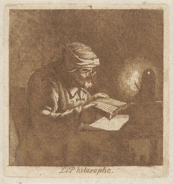 Editor: Here we have "A Scholar by Candlelight," an etching created before 1841, attributed to Joannes Bemme, currently residing in the Rijksmuseum. The way the light is hitting the scholar's face creates such a contemplative mood. What stands out to you about this piece? Curator: The strong chiaroscuro is definitely striking. We can immediately place this work within a broader history of printmaking where artists were actively engaging with and disseminating styles from other mediums like painting. Think about how printmakers throughout Europe tried to mimic painters' techniques like sfumato with etching or engraving. How might the rise of print culture and its relatively low cost, accessible to a wider public, influenced the themes artists chose to portray? Editor: So, you’re saying that printmaking democratized art by making it more affordable and accessible, which then impacted what subjects artists depicted? Like genre scenes or history painting? Curator: Precisely. Also notice how the subject of the "scholar" engaged in study gains traction throughout the seventeenth century as education and humanism took center stage. How might the function of such prints have shifted from pedagogical tools to representations of societal values? Was this print perhaps displayed to signal something about the owner’s taste or status? Editor: I hadn't considered how owning an image of a scholar might convey status. So much to think about! Thanks for sharing that historical context. Curator: And thank you for drawing my attention to how the mood is amplified by light in this etching; I will certainly ponder the distribution and societal implications around prints now.