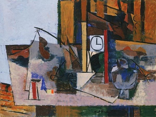 Karl Knaths made this painting, Cin-Zin, with oil on canvas, and it's a lovely jumble of shapes and colors, like a party in a picture. The colors are muted, but there's a boldness to the way he's slapped them down. I'm drawn to how Knaths builds this world with texture. Look at that stroke of brown with the squiggles crawling on top! It reminds me of a curtain, or maybe even a strange animal. See how the white almost seems to glow against the darker, earthier tones? The paint isn't trying to hide itself; it’s thick, present, and almost wants to be touched. Knaths reminds me a bit of Stuart Davis, another American painter who loved to play with signs and symbols. And just like Davis, Knaths invites us to look beyond the surface. Is it abstract, or a still life? Does it matter? Either way, it feels like a conversation, an exchange of ideas, and a reminder that art is always in motion, always becoming.