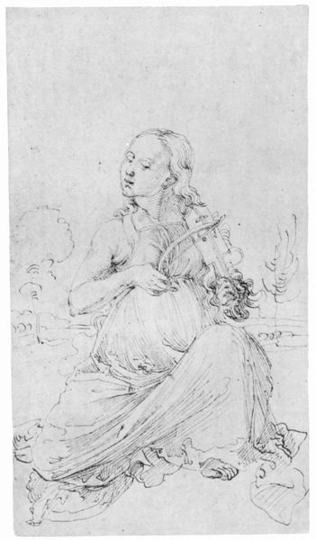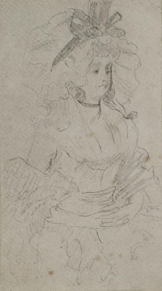 Curator: Looking at this image, I immediately perceive a delicate sadness. The soft pencil strokes almost weep across the paper. Editor: Well, let's bring everyone up to speed. What we have here is "Kvindehoved med nedslåede øjne," which translates to "Head of a Woman with Downcast Eyes." It's a pencil drawing attributed to Alessandro Gherardini, dating somewhere between 1655 and 1726, now residing here at the SMK. Curator: The downcast eyes, they evoke a specific feeling, don't they? It’s like she's carrying a silent weight. It pulls us in, demanding empathy. Think of how the eyes serve as portals to the soul and the symbolic implications of them being closed. Editor: Absolutely. But let’s consider the period. This piece sits squarely in the Baroque era, a time of great upheaval and also immense artistic production fueled by patronage networks. Her closed eyes are likely not a symptom of sadness, but simply of contemplation, maybe representing her position in life, or more broadly representing the artist’s ability to represent something holy in visual terms. Curator: Contemplation, yes, but what drives that contemplation? Perhaps the turmoil of the Baroque manifested even in portraiture, leading to a subdued interiority? Editor: Interesting. Though portraits are mostly considered records of power, or displays of social capital. Still, a drawing of this intimacy must signify a closeness between the artist and the sitter, or the patron, I imagine? Curator: Perhaps. Or it's about invoking specific associations. Closed eyes often signify mourning, memory, even a kind of otherworldly access— connecting to what cannot be seen. And a society that often mourned, like any other. It could serve to amplify or soften existing symbolism through subtle gestures that resonate psychologically even now. Editor: Right, she invites different interpretations based on her pose and attire. Regardless, it is a fantastic insight into Baroque drawing practices. A true treasure within this collection that offers new connections with past experiences. Curator: Yes, a simple image that still yields abundant meaning and lasting connections.