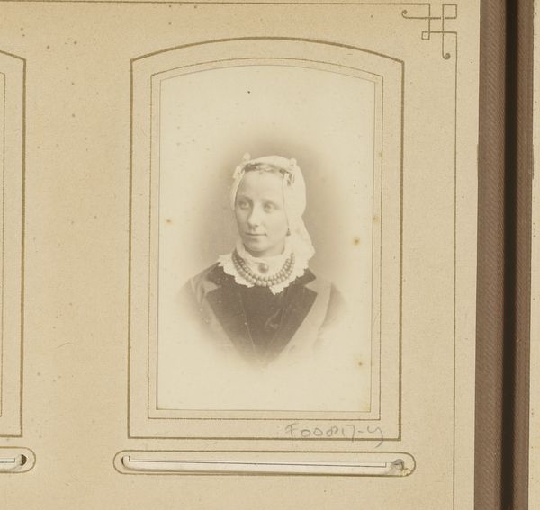 Editor: Here we have a gelatin silver print from between 1880 and 1918, attributed to J. Siewers & Zoon, titled "Portret van een vrouw met witte klederdrachtmuts", or "Portrait of a woman with a white traditional bonnet". It's quite striking; the starkness and direct gaze give it a very grounded feeling. How do you read the symbolism in this image? Curator: Well, the traditional bonnet, the "klederdrachtmuts," speaks volumes. It's not merely headwear, it is a marker of identity, signaling regional belonging, marital status, and often religious affiliation. It’s cultural memory made visible. The whiteness might signify purity or a particular community aesthetic. Look closely at the floral embellishments; they hint at celebrations or specific life events integrated into everyday wear. Editor: So it’s less about individual expression and more about representing a collective identity? Curator: Precisely. And think about the implications of capturing this image. Photography, even then, had the power to freeze and preserve cultural traditions that were perhaps already transforming. It begs the question: is this portrait a celebration, a documentation, or perhaps even a form of cultural preservation against inevitable change? What feelings does the photograph elicit in you? Editor: I guess it makes me think about how much we've lost and how much those objects, like her bonnet, meant to the people wearing them. It's not just clothing; it's history. Curator: Indeed. And it’s our role to decode those symbols and understand the weight they carried, and perhaps still carry, for communities past and present. Images such as these remind us of the depth encoded in the objects that surround us. Editor: I hadn't considered all the layers embedded in the bonnet alone. It changes how I see the entire portrait. Curator: That is the beautiful challenge and reward of looking closely at the world of symbolic imagery.