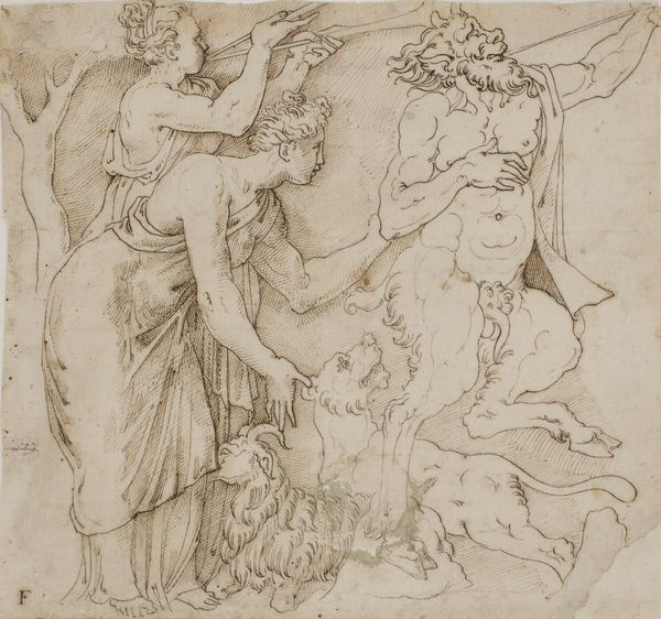 Editor: This drawing, titled "Study from a Statue of a River God," dates back to somewhere between 1600 and 1700. It’s an anonymous work, rendered in pencil. I’m really drawn to the classical feel and the multiple angles of the figure. What do you see in this piece? Curator: Well, first, notice how the artist repeats the head at different angles. This technique highlights not just the physical likeness, but also emphasizes the god's symbolic attributes – the laurel wreath, for instance, traditionally a sign of victory and status. It is no simple portrait, it invokes historical and cultural memories. Editor: Interesting. I was so focused on the artistic style; I didn't immediately consider the symbolic weight. So, is this repetition a deliberate act of imbuing the figure with cultural significance? Curator: Precisely! Think about how river gods were viewed – embodiments of the life-giving force of water, often associated with fertility and abundance. The artist uses repetition and careful detail to tap into these archetypal meanings, reminding us of humanity’s timeless connection to the natural world and, by extension, our own cyclical existence. Do you see that circular device on the lower right, near the seated figure? Editor: Yes, it almost looks like a stamp or signature. I was so absorbed by the more prominent God I hadn't really noticed. Curator: Consider how symbols evolve. Does that symbol have ties to the cultural milieu or perhaps hints about the artists? Remember, every detail can resonate with echoes of the past. How can those connections shape our view? Editor: This has shifted my focus completely. The layers of meaning, revealed through what seemed like a simple drawing, are really quite profound. I’ll definitely be paying more attention to the symbolism going forward! Curator: Indeed. And how those symbols carry cultural meaning from one century to the next. This single study embodies centuries of collective experience.