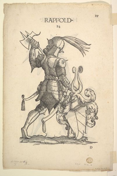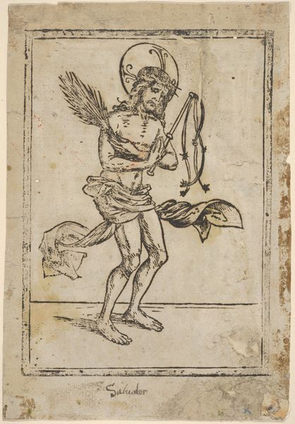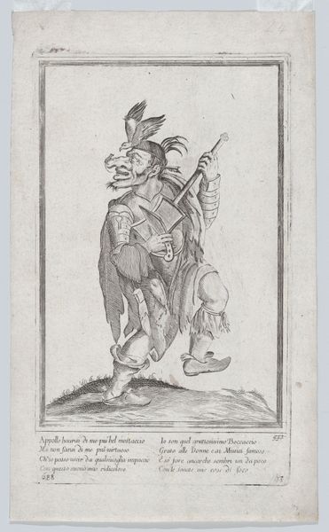 Editor: This is an engraving, likely a print, made between 1635 and 1645 by an anonymous artist. It's called "A caricature figure (a carpenter?) with a toad on his nose, carrying various implements walking to the left." It has an almost grotesque quality that's kind of captivating. What historical or cultural ideas come to mind for you when you look at it? Curator: The image certainly fits into a broader tradition of caricature that emerged strongly in the 16th and 17th centuries. Caricature often functions as social critique. It’s a visual language for lampooning individuals or types within a given social context. Here, the figure, presumably a carpenter based on the tools, is mocked, perhaps for his aspirations to a higher social status suggested by the elaborate hat and the drinking glass he’s hoisting. Editor: So, the toad on his nose, the tools he carries, and the tattered clothes – those are all clues pointing towards this mockery? Curator: Precisely. And look at the inscription. It mentions fashion, scholarship ("il dotto"), and drinking, all possibly targets of satire. In considering the social context, we must ask who is being mocked, and who is doing the mocking. This was likely circulated among a specific social group who found humor and perhaps social reinforcement in such images. This form of art reveals power dynamics within a specific social milieu. Editor: I never really considered the role of the intended audience. Curator: The market for prints like these were often middle-class people and they allow art historians a window into past social values. Editor: That’s fascinating! It really changes how I see this piece. It's more than just a funny picture; it’s a snapshot of social attitudes of the time. Thanks, that’s something to think about.