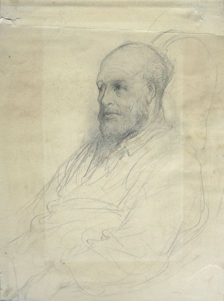 Curator: Here we see a portrait of Paul Falconer Poole, a genre painter from Britain. It was executed in oil by Frank Holl in 1879. The work is part of the collection at the National Portrait Gallery in London. Editor: Immediately, the intensity of his gaze strikes me. It’s almost a haunted look, accentuated by the dark shading around his head. The way the artist focuses on the face suggests the weight of years etched into his features. Curator: Poole, in his time, occupied an interesting position within the art world. Though considered a genre painter, his work, especially his landscapes, were often laden with social commentary. Editor: His face itself carries so many stories. The beard, a symbol of wisdom and experience, combined with those deep-set eyes makes me think of someone burdened by knowledge, by witnessing too much. Curator: It's fascinating how artists depict other artists. Holl here presents Poole with a certain gravity that mirrors the shifts happening in art institutions at the time. There was a growing tension between academic painting and new, more socially conscious forms of expression. Editor: Do you think the stark contrast between light and shadow could symbolize that tension? The lighter tones illuminating the face represent outward persona, the darker ones looming as inner turmoil or conflict. Curator: It's quite possible. And it reminds us how portraits are never truly objective records; they are interpretations, laden with the artist's own perspectives and perhaps even anxieties. Frank Holl, in capturing Poole, may have been commenting on the changing role of the artist in society. Editor: Perhaps he was portraying his own anxieties about shifting values onto Poole. Regardless, it is powerful, evocative, making me contemplate the inevitable link between creator, subject, and culture.