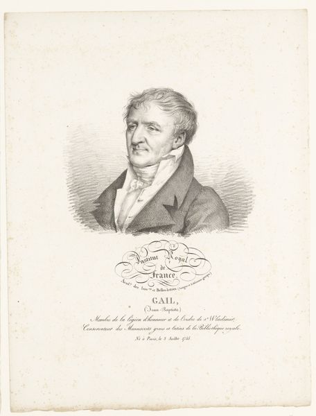 Curator: Julien-Léopold Boilly created this engraving in 1820. It's titled "Portret van de wiskundige Gaspard Monge, graaf van Péluse," or "Portrait of the mathematician Gaspard Monge, Count of Péluse" Editor: It’s such a stern, almost confrontational image. The starkness of the engraving emphasizes the sharp lines of his face, highlighting every wrinkle and crease. He feels...intense. Curator: Right, the artist definitely captured a sense of authority. Look at the detail around the eyes; Boilly really understood how to use light and shadow to convey intelligence and experience. Monge was a major figure in his time, a key figure in the French Revolution. Editor: Oh, definitely a revolutionary spark there. I see the "Institut Royal de France" elegantly inscribed. The lettering, combined with the comte's severe gaze, projects this aura of Enlightenment reason and perhaps a touch of the anxieties underlying it. There's the drive for intellectual progress, juxtaposed against the…weariness of the gaze? Curator: That weariness intrigues me. Monge lived through tumultuous times – revolution, the Napoleonic era, restoration…all influencing his philosophical development and perhaps taking its toll. Editor: Symbols of intellectual status surround him too; even the way his cravat is tied hints at status, doesn’t it? A meticulously crafted image of power and intellectual capability, even the shading used to define the texture of his coat. Curator: There’s almost an austerity about this piece, that recalls some ancient busts from Greece. Very in line with the Neoclassical style which focuses on sober aesthetics as a message. Editor: Looking at it, I get the feeling of gazing at history itself. Curator: It is history! A tangible reminder of a brilliant mind caught in the sweep of monumental change. I wonder, did Boilly manage to reveal the weight of that experience? Editor: Absolutely, It seems the more you look the more apparent Monge’s personality appears, the light bringing forth both intellect and character in this printed work.